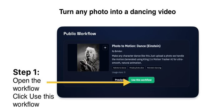 3/10/2026How to Make your Photo dancing same as on VideoShare: /how-to-use/photo-to-dance-videoInfo how to create such videos from photoOpen ready public workflow: Phtot to Dance Continue regarding instructions on images below:https://v4v.ai/workflows/public/69acf1d84bf3dc993ea4c07c
